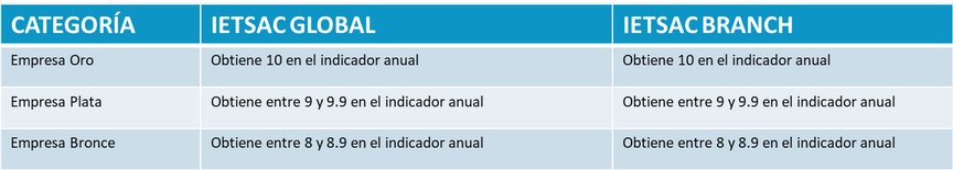 Dependiendo de los resultados anuales obtenidos por la empresa se otorgará y/o refrendará una certificación que avala que la empresa es una compañía comprometida con la plena satisfacción de sus clientes y que se preocupa y ocupa por mejorar la calidad de los servicios y/o productos que le ofrece. Este certificado podrá tener 3 categorías distintas de acuerdo a lo que se muestra a continuación.